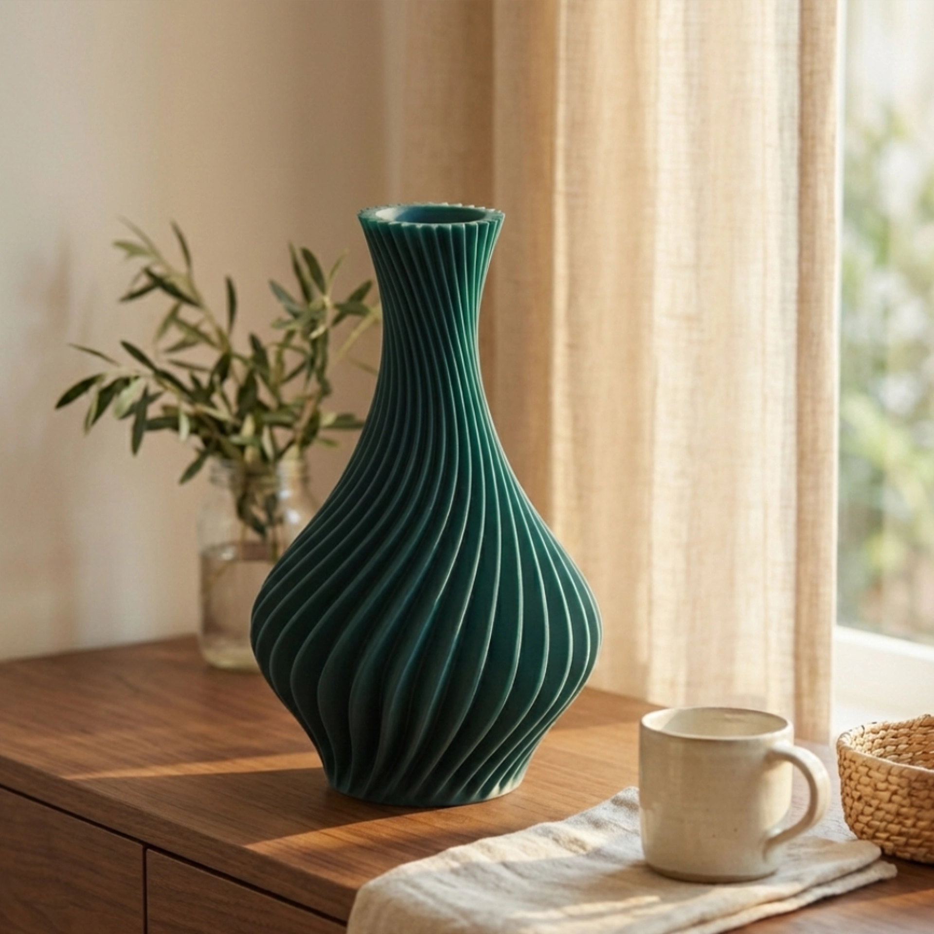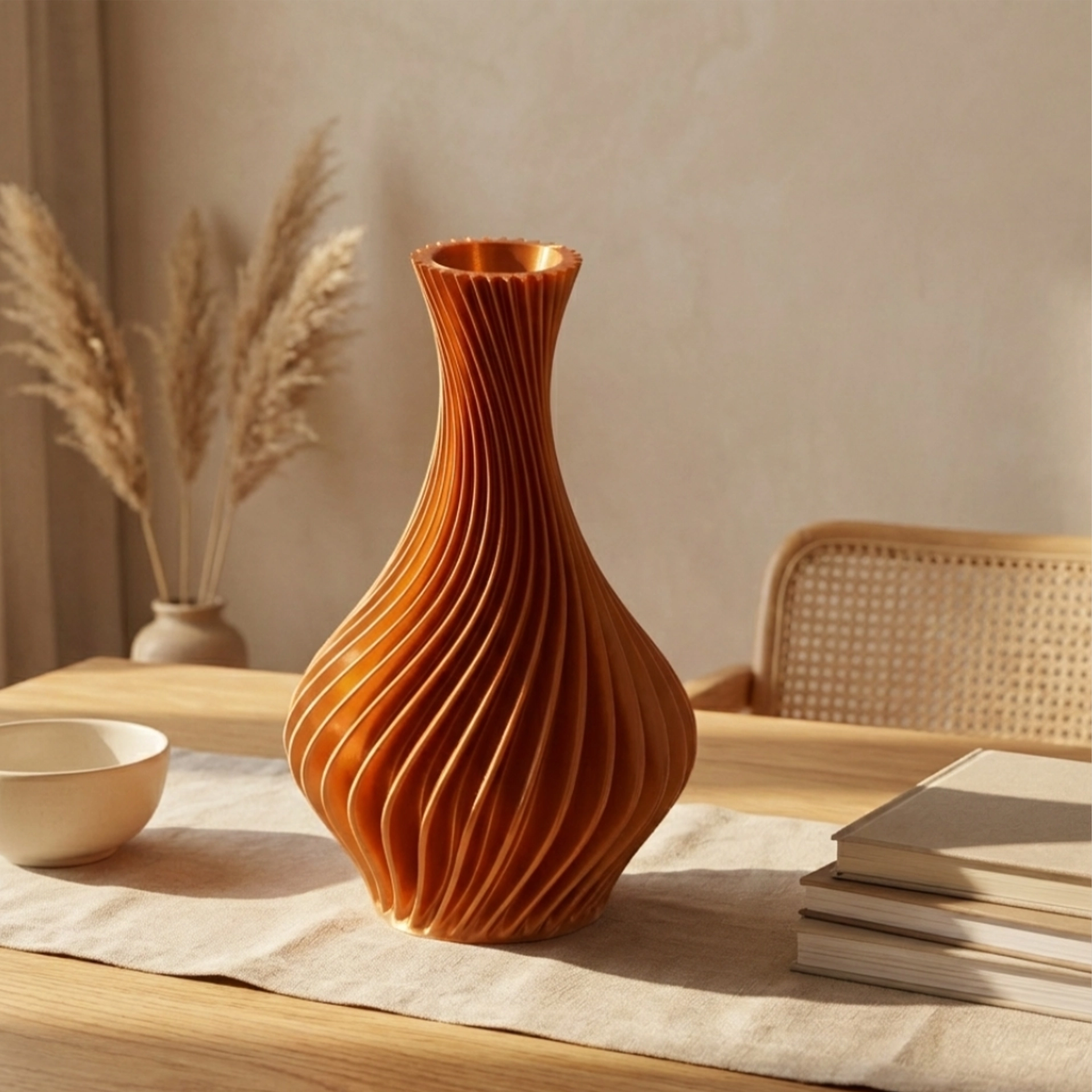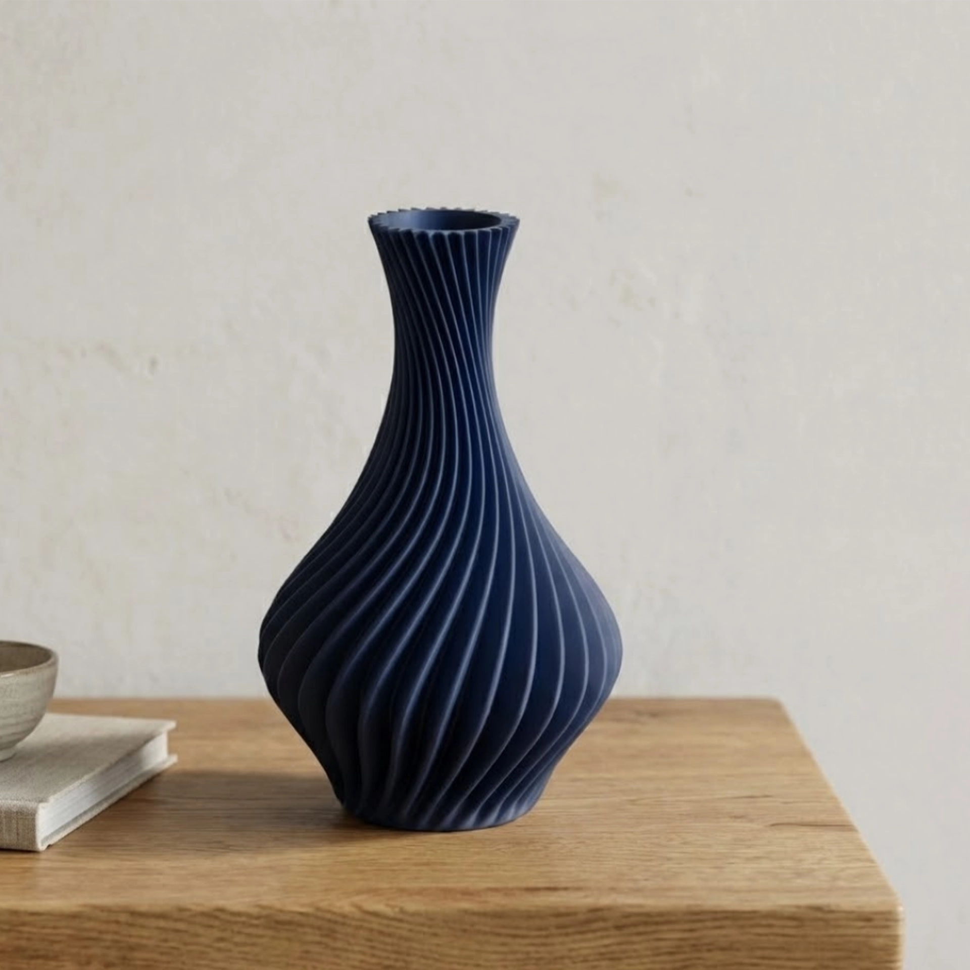 Its spiral ribs bring energy and depth without clutter, creating a premium play of light and shadow from every angle. Choose a bold colour to make it the hero, or a quieter tone to blend into a refined, modern palette.